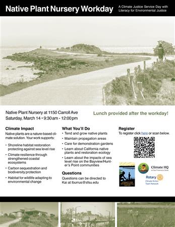 Join RCAT & SFSU Climate HQ for a Climate Justice Service Day Native Plant Nursery Workday | Saturday, March 14, 2026 9:30 AM–12:00 PM | Native Plant Nursery, 1150 Carroll Avenue, San Francisco | Lunch provided!